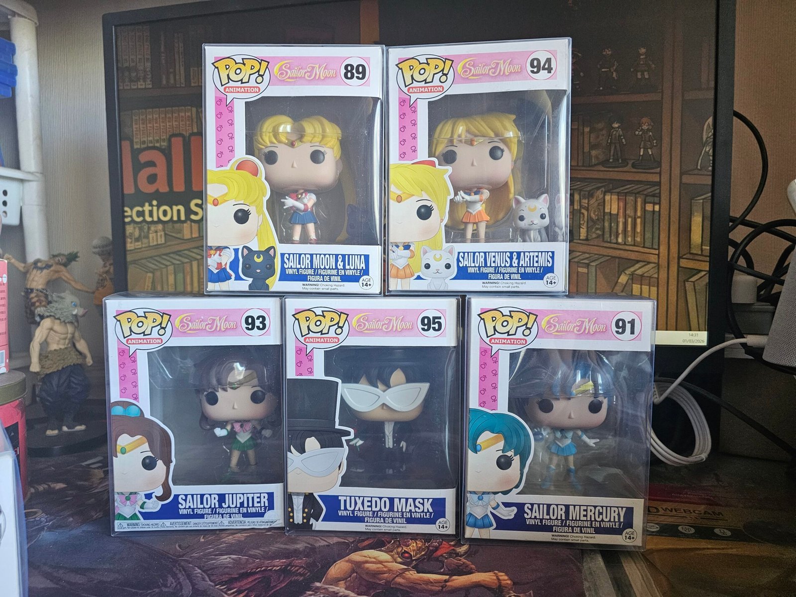 Lleva a casa este exclusivo set de figuras Funko Pop! de la famosa serie Sailor Moon. El pack incluye a Sailor Moon con Luna, Sailor Venus con Artemis, Sailor Jupiter, Tuxedo Mask y Sailor Mercury, todos en sus cajas originales y perfectos para coleccionistas y fanáticos del anime. Ideal para decorar tu espacio o ampliar tu colección. ¡No te quedes sin el tuyo!